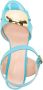Aqua blauw, kalfsleer, open neus, amandelvormige neus, voetbed met logo, gekruiste band bij de neus, goudkleurig materiaal, enkelbandje met gespsluiting, blokhak en plateauzool.