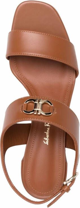 Gancini plakkaat, open neus, leren binnenzool met logo, enkelbandje met gespsluiting en lage blokhak. Materiaal: leder.