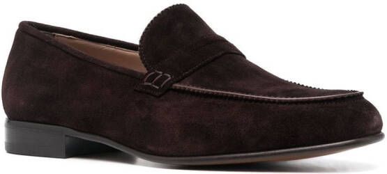 Koffiebruin, kalfssude, penny loafer stijl, verfraaide neus, amandelvormige neus, contrasterende stiksels, lage gestapelde hak en leren binnenzool met logo.