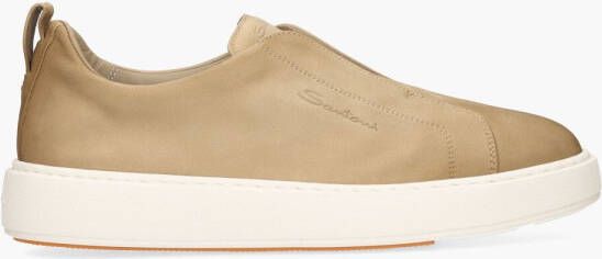 Sneakers voor heren 21965 van het merk Santoni. Deze handgemaakte herenschoenen hebben een bovenzijde van gebroken wit gestructureerd kalfsleer en off-white sude. Op de oranje leren bewerking opzij en op de hielcap in groen leer zijn Santoni logo's zichtbaar. De binnenkant is in soepel leder uitgevoerd. Off-white katoenen veters, branding