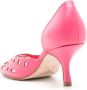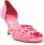 Kauwgomroze, leer, slip-on stijl, uitgesneden detail , open neus, leren binnenzool met logo en halfhoge hak.