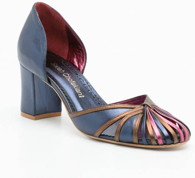 Metallic finish, halfhoge blokhak, voetbed met logo en ronde neus. Materiaal: leder.
