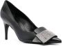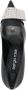 Zwart, kalfsleer, lamsleer, verfraaid met kristallen, puntige neus, slip-on stijl, binnenzool met merk, hoge stilettohak en leren zool.