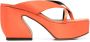 Perzikoranje, kalfsleer, satijnen finish, open neus, voetbed met logo, hoge blokhak en plateauzool.