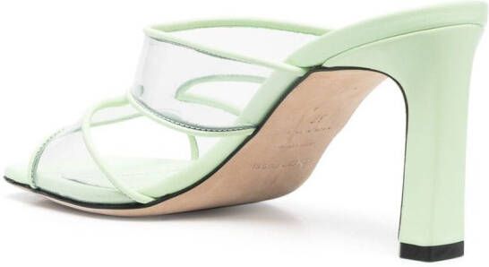 Mintgroen, lamsleer, doorzichtige bandjes, open neus, slip-on stijl, voetbed met logo, hoge hak en leren zool.