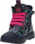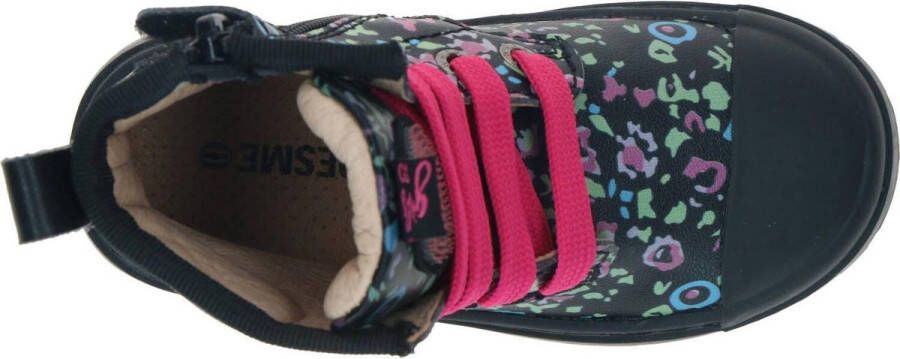Shoesme veterboot in het zwart met fleurige dierenprint en opvallende roze veters. Deze schoenen zijn gemaakt van textiel en hebben een voering gemaakt van leer. De loopzool is gemaakt van kunststof. De schoen heeft een rits- en vetersluiting en het voetbed is uitneembaar.