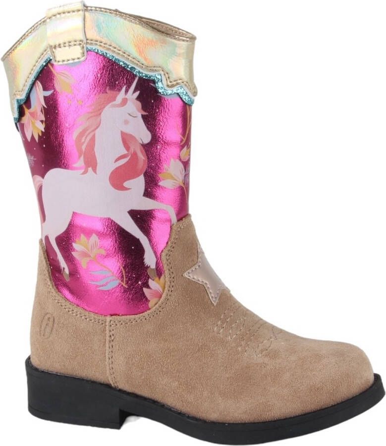 Stap in stijl met de roze cowboylaarzen NW24W010 van SHOESME. Perfect voor avontuurlijke meisjes die houden van een vleugje western flair. Deze laarzen zijn gemaakt van beige sude en hebben een toffe print van roze leahterlook met een eenhoorn en bloemen. De binnenvoering is gemaakt van leer en heeft een uitneembaar voetbed. Door de ritssluiting is de laars gemakkelijk aan-en uit te trekken. De opvallende roze kleur en de speelse details maken deze laarzen een echte eyecatcher. Laat je innerlijke cowgirl stralen en geniet van comfort en stijl in n. Met deze laarzen aan je voeten ben je klaar voor elk avontuur!