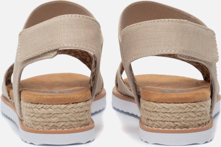 Deze Skechers Bobs Desert Kiss sandalen in de kleur beige zijn gemaakt van textiel. De voering en comfortabele binnenzool zijn van synthetisch. De zool is gemaakt van rubber en heeft een dikte van 1 centimeter. Maatadvies: bestel een maat kleiner.