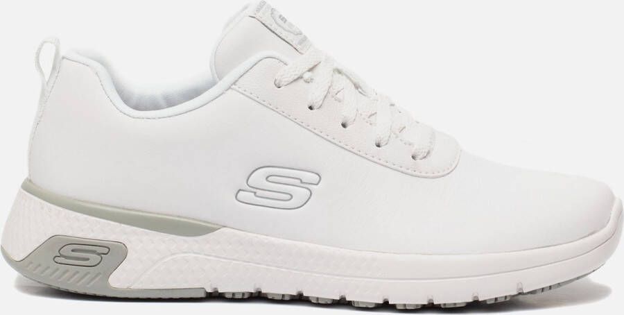 Deze sportieve Skechers Work sneakers in het wit zijn gemaakt van synthetisch leer. De voering en comfortabele binnenzool zijn gemaakt van textiel. Door middel van de veters zijn de schoenen te sluiten. Het aantreklusje aan de achterkant helpt je bij het instappen. De schoen is voorzien van een Memory Foam voetbed en een FlexSole tussenzool. Hierdoor zijn de sneakers schokabsorberend en dempend, wat zorgt voor extra comfort. Door de slipbestendige rubberen zool heb je extra veel grip!