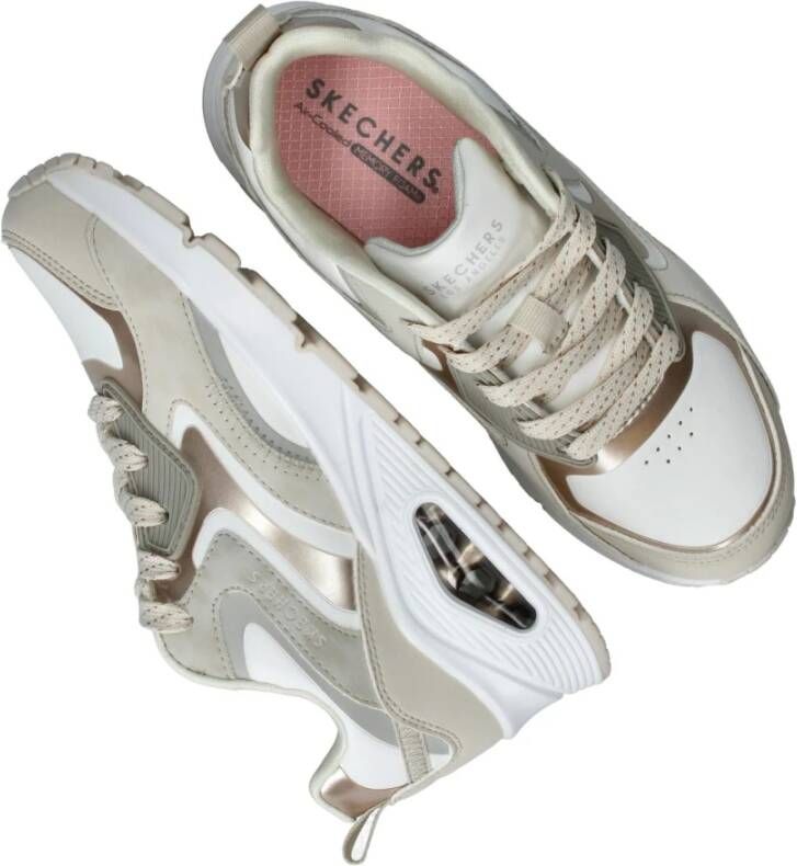 Verhoog je stijl met deze sportieve Skechers Uno Gen 1 Color Surge sneakers voor meiden. De witte sneaker heeft beige accenten en gouden glitter in de veters. Hij is voorzien van een Air-Cooled Memory Foam binnenzool voor ultiem comfort. De verharde hiel zorgt voor extra stabiliteit tijdens het lopen, en de gewatteerde enkel biedt extra ondersteuning. Stap zelfverzekerd de deur uit met deze trendy sneakers