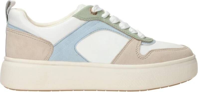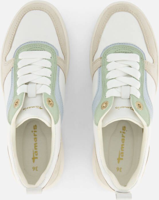Trendy Tamaris veterschoen voor dames in het wit met zachte pastel kleuren. De sneaker heeft een gave platformzool maar is toch heel licht van gewicht.