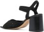 Zwart, kalfsleer, geweven design, open neus, enkelbandje met gespsluiting en blokhak.