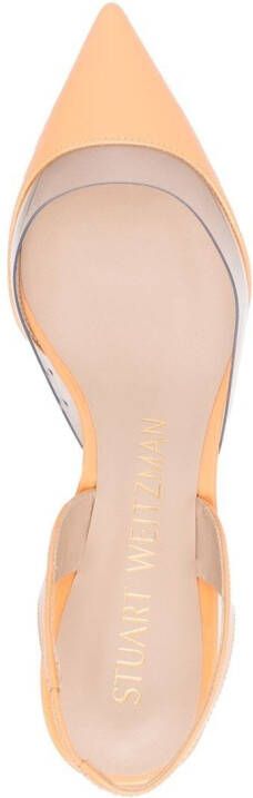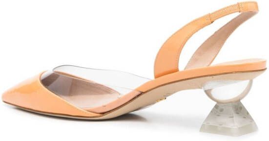 Lichtoranje, doorzichtig vlakdetail, puntige neus, leren binnenzool met logo, slingback bandje en halfhoge geschulpte hak.