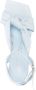 Lichtblauw, verwassen denim, kalfsleer, geknoopt detail, open neus, vierkante neus, enkelbandje met gespsluiting en hoge stilettohak.