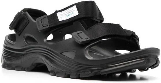 Zwart, uitgesneden detail, logopatch aan de zijkant, klittenbandsluiting, slingback bandje, voorgevormd voetbed, lage geschulpte hak en rubberen zool.