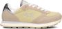 Sun68 is een Italiaans modemerk met casual designs van de beste materialen om iedere dag te dragen. Er is veel aandacht voor originele details en onderzoek in goede materialen. Dit goudkleurige model Girls Ally Glitter met zilverkleurige accenten is uitgevoerd in stevig glitter textiel en heeft een afwerking van beige suède panelen. Op de zilverkleurige tong bevindt zich een wit textiel label met de opdruk: "Run Faster Than YOU Can" en de hiel heeft een zilverkleurige, leren hielkap met zwarte merkopdruk. De zilverkleurige geborduurde merkopdruk op de zijkant en de grijze accentstreep in de zoolrand maken ‘m extra opvallend. Deze lichtgewicht sneaker is gevoerd met ademend mesh en heeft een vast voetbed met comfortabele demping. Door de gewatteerde enkelkraag en tong ervaar je veel steun en met de beige loopzool met vierkanten noppen profiel heb je een optimale grip. Let op: Grote maten hebben een vetersluiting en kleinere maten een klittenbandsluiting!
