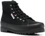 Zwart, canvas, enkellengte, logolabel, ronde neus, vetersluiting aan de voorkant en platte rubberen zool.