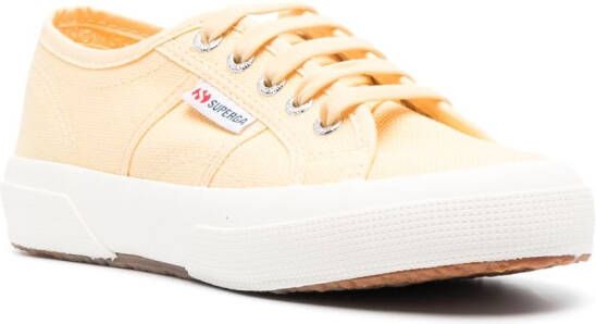 Lichtgeel, canvas, logolabel, ronde neus, veters aan voorkant, binnenzool met merk en platte rubberen zool.