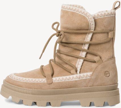 Deze stijlvolle Tamaris snowboots in de kleur beige hebben een bovenwerk van leer. De voering en comfortabele binnenzool zijn van textiel. De boots hebben een rits- en vetersluiting voor een comfortabele pasvorm en een schachthoogte van 16 cm. De zool is gemaakt van rubber en heeft een dikte van 3, 5 centimeter