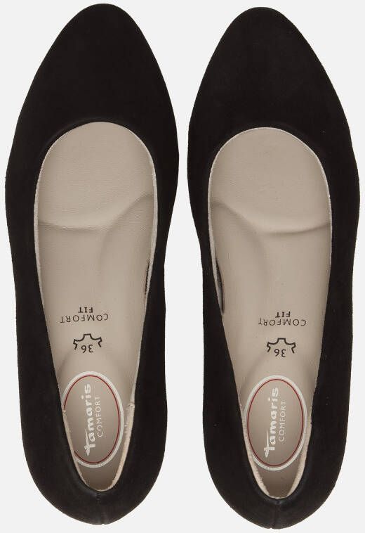 Deze Tamaris Comfort pumps in de kleur zwart zijn gemaakt van suede. De voering en comfortabele binnenzool zijn van leer. De pumps hebben een uitneembare zool en een blokhak. De zool is gemaakt van rubber en heeft een hakhoogte van 5 centimeter.