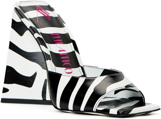 Leer, zebraprint, vierkante neus, open neus, voetbed met logo, hoge geschulpte hak en slip-on stijl.