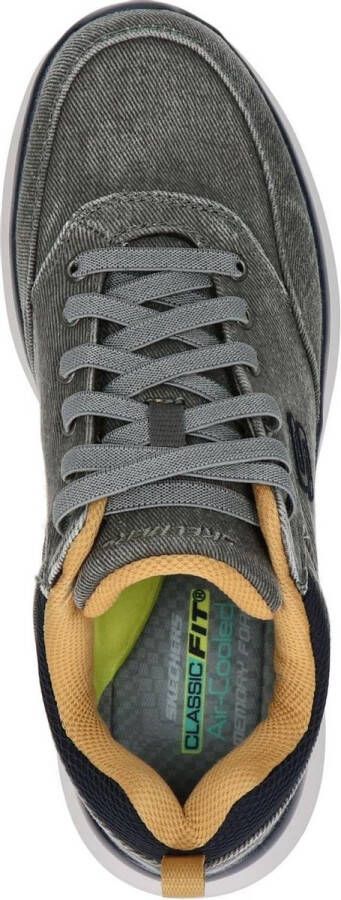 Grijze Skechers Delson 2.0 Kemper sneakers voor heren. Gemaakt van textiel, een binnenwerk van textiel en een stevige profielzool. De sneakers hebben een vetersluiting en hiellusje voor een makkelijke instap. Het vaste voetbed is gemaakt van textiel. Deze bevat Air Cooled Memory Foam voor extra comfort. De lichtgewicht sneakers hebben merkopdrukken op het bovenwerk en een witte zool. De schoenen zijn gemaakt van 100% vegan materialen.