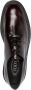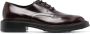 Bordeauxrood, kalfsleer, vetersluiting aan de voorkant, ronde neus, leren binnenzool met logo, lage blokhak en rubberen buitenzool.