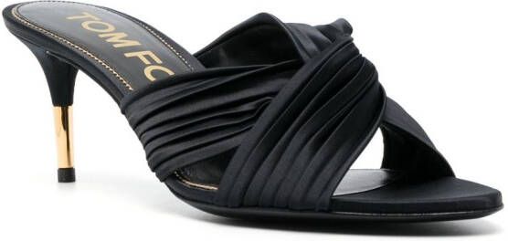 Zwart, satijnen afwerking, geplooide stijl, geknoopt detail, open neus, puntige neus, voetbed met logo, halfhoge hak en slip-on stijl.