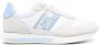 Wit, lichtblauw, kalfssude, design met vlakken, logopatch aan de zijkant, logopatch op de tong , ronde neus, vetersluiting aan de voorkant en platte rubberen zool.
