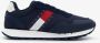 Van het sportieve Amerikaanse merk Tommy Jeans is deze lage sneaker Retro Leather van donkerblauw textiel in combinatie met donkerblauwe overlays in leer en sude. De zijkant van de schoen is voorzien van het welbekende vlaglogo in het zwart, zit er op de tong een zwart merkopdruk en zit er op de hielcap wit sude