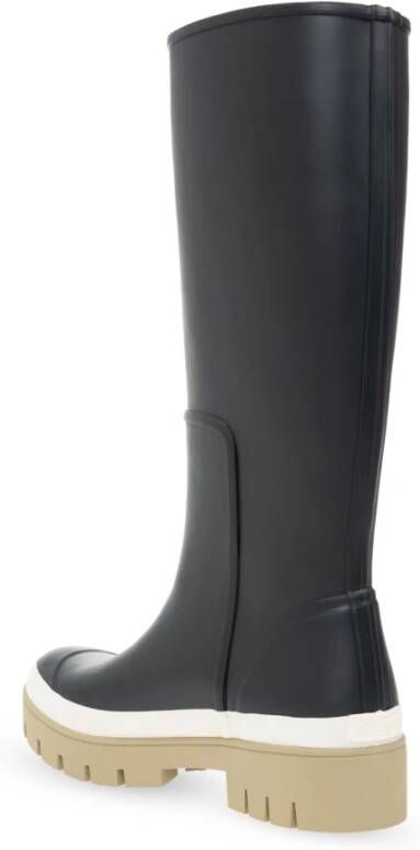 The Hurricane Tall Wellington Rain Boots by Tory Burch offer a sophisticated blend of modern design and practicality. Featuring a deep black upper contrasted with a bold beige sole, these knee-high boots present a minimalist aesthetic highlighted by clean lines and subtle stitching. The embossed Tory Burch logo adds a touch of luxury, while the chunky, textured sole provides both a contemporary edge and enhanced durability, ensuring a statement-making yet versatile look