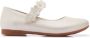 Wit, leer, lakleren afwerking, bloemdetail, ronde neus, klittenbandsluiting aan de voorkant en rubberen zool.