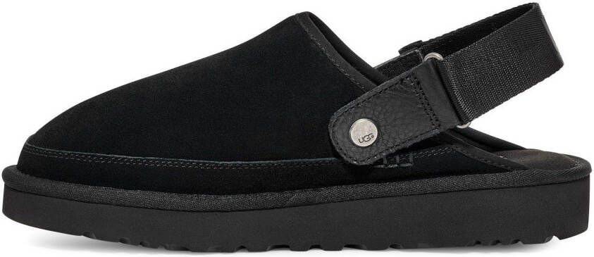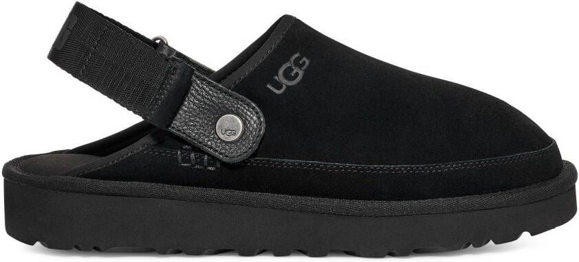 Step into total off-duty comfort with these men's Goldencoast Clog sandals from UGG. In a staple Black colourway, these clogs have a premium suede upper and a textile lining made from 100% recycled polyester fibres. They sit on a microfibre sockliner and foam footbed for a plush feel, while the sugarcane EVA outsole adds cushioning in every move. With a textured tread for essential grip and a hook-and-loop strap to the heel, they're finished with tonal UGG branding.. Material: Leren bovenwerk/synthetische zool