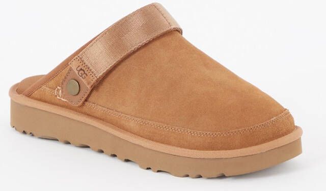 Bruine UGG leren sabot voor mannen met ronde neus, achterste klittenbandsluiting en logo in contrasterende kleur aan de voorkant. Schoen valt normaal qua maat.
