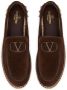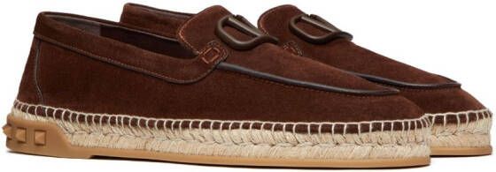 Chocoladebruin, lamsleer, VLogo kenmerk, amandelvormige neus, binnenzool met merk en gevlochten raffia zool.