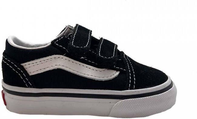 Vans Old Skool Velcro Black True White Junior schoenen De Old Skool V is genspireerd op de klassieke skateschoen van Vans. Deze lage schoen heeft een bovenwerk van stevig canvas en sude, een klittenbandsluiting, een gevoerde kraag voor ondersteuning en flexibiliteit en de kenmerkende rubberen wafelzool