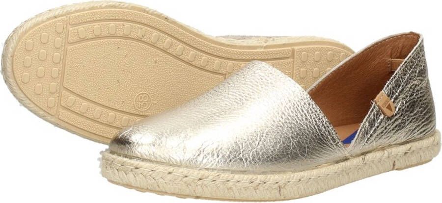 Wie denkt aan de zon en dieheerlijke zomerse dagen, denktaan luchtige kleding en fijne espadrilles. Het merk VERBENAS is op en top Spaans en weetals geen ander hoe eenespadrilles moetaanvoelen. Zij maken al hun modellen op ambachtelijke authentieke wijze en dat is te zien. Zo ookdit metallic goudenmodelCARMEN van zacht en soepel leer met een binnenwerk van sude in combinatie met een voetbed van leer. Het vaste voetbed is voorzienvan een dempende onderlaag van schuim waardoor de espadrille nog comfortabeler is en jij er de hele dag op kunt lopen. Opvallende details zijn de speelse uitsnede aan beide zijkanten van de schoen en het grove stiksel in de jute zoolrand.Aan de zijkant van de schoen bevindt zich een subtiel leren merklabeltje ende binnenzijde heeft op de hiel een kleine elastieken inzet, zodat de schoen perfect om de hiel blijft zitten. De jute zool geeft de schoen die kenmerkende zomerse look en de rubberen loopzool zorgt voor een goede grip bij lange wandelingen.