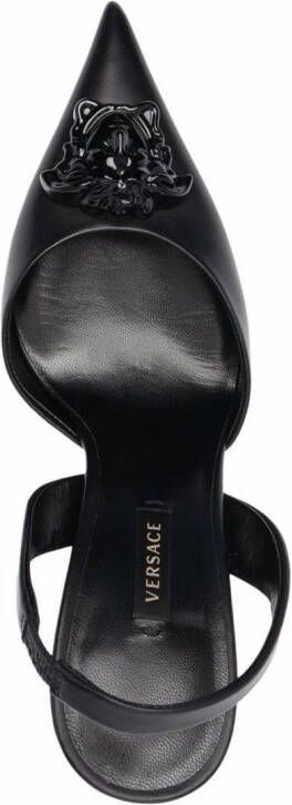 Puntige neus, Medusa detail, binnenzool met logo, tonale stiksels, slingback bandje, Medusa patroon en geschulpte hak. Materiaal: leder.