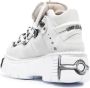 Wit, kalfsleer, kalfssude, ronde neus, veters aan voorkant, enkellengte, rubberen zool en plateauzool.