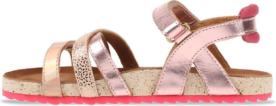 Leren Vingino shoes sandalen Vienna met klittenbandsluiting voor meisjes in de kleur roze met gekleurde metallic look. Het klittenband zorgt ervoor dat de voet stevig in de sandaal zit en dat de sandaal aan de voet aan te passen is. De bandjes zijn aan de binnenkant gevoerd met suède en het suède voetbed is licht voorgevormd. De zool van kurk met een bubblegum roze rubberen loopzool met antislip profiel. Perfecte sandalen om de zomerlook compleet te maken