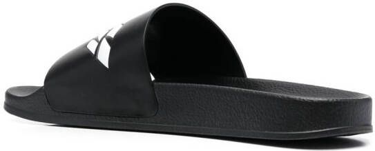 Logoprint op de voorkant, slip-on stijl, open neus en platte zool. Materiaal: leder.