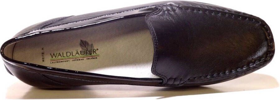 Instap moccasain van Waldlaufer in zwart calfsleer met een lakrand . Art. 431000 Harriet heeft een rubberzool en is in de wijdte H uitgevoerd. Deze instapper heeft een uitneembaar voetbed.