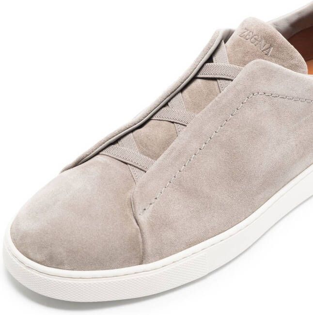 grijs sude dubbele ritssluiting bij de hiel elastische bandjes ronde neus leren binnenzool met logo platte rubberen zool slip-on stijl